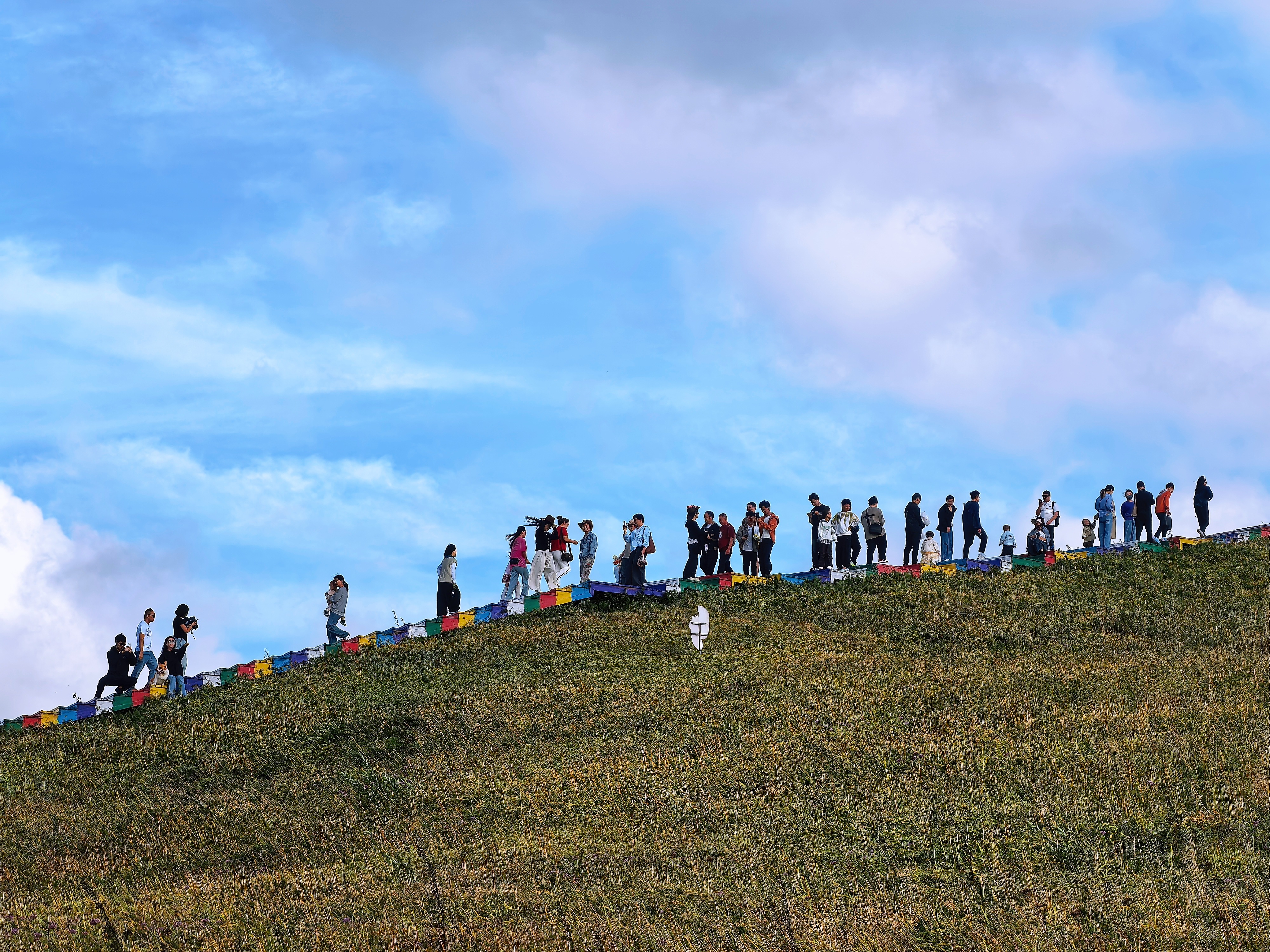 游客们迎着落日余晖漫步,身影被拉得修长,与远处的山峦、近处的草甸构成一幅静谧的剪影画,让这份独属阿西里西的黄昏诗意,深深印刻在每个游客的心底。
